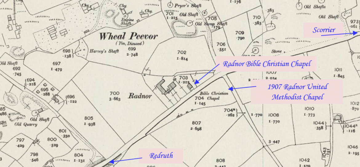 1906: Radnor Bible Christians. Plans for the erection of new and more commodious Bible Christian Chapel at Radnor, near Redruth, were submitted to the Redruth Urban District Council at their meeting on Monday and duly passed. Radnor Bible Christian Society is now in a much healthier state than was the case a few years ago. (Cornubian and Redruth Times – Saturday 24 November 1906)
