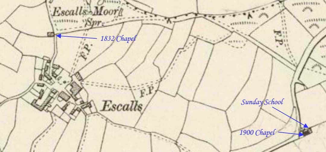 The chapel was north of the village at the apex of Escalls Moor in a field. It can be seen on old maps. The chapel is now lost, replaced by its successor in 1900. The field wall may well contain stones from it.