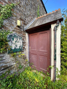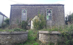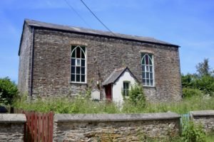 Wayside Wesleyan chapel with later fittings. Segmental recess behind altered rostrum for former preacher’s seat, flanked by tables of the decalogue painted on metal panels. Killas rubble walls, scantle slate roof. 2-window side-wall entrance with later gabled porch. Forecourt wall with quadrant-plan to gate-piers, wrought-iron gate. Unspoiled example. Listed in Stell (b1). (Heritage Gateway)