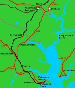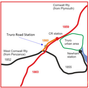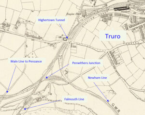 I hesitate to call this a branch line as it was once Truro’s main station and how great it must have been to alight next to the river, albeit mud a lot of the time. It was Truro’s second station – the first, Truro Road, was where indicated on the image below.