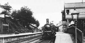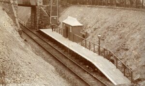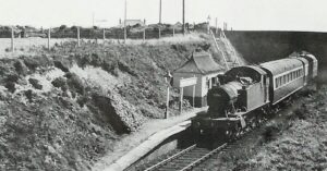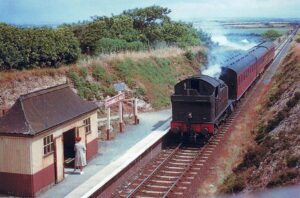 Mount Hawke Halt and heading for St Agnes – by now the wooden platform has been replaced with concrete and the traditional pagoda shelter is in place (Photo: courtesy Clive Benney)
