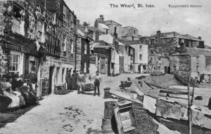 Wharf Road, known as ‘Beach’, consisted mainly of dilapidated buildings overlooking a roadway just above the harbour sands, though films show that there was a Salvation Army citadel, Lifeboat and Customs Houses. Two main communities provided occupations for local people, namely fishing and mining; Downlong was where fishing families lived as it gave access to the harbour and the necessary associated industries. Traditionally ending at Market Place, it was then a short walk up High Street to the Stennack [tin] mines, while the surrounding area was known as Uplong. Mining continued as far as the large Consols Mine at Hellesveor and then spread beyond it. Recently, ancient shafts from this old discarded mine have caused damage in the Ayr Estate, as have adits that ran eastward underground to empty excess mine water into the sea.