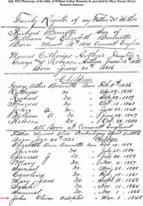 In 1873, John met and married Ellen Benney. Ellen’s parents, James and Elizabeth (Bennetts) Benney had emigrated from Cornwall in 1844 settling first in Mineral Point, Wisconsin and later California in 1854. Ellen was born in 1855 at the Michigan Bar Mining Camp on the Cosumnes River in Sacramento. We knew a great deal about our Benney and Bennetts families, but John’s parentage was still a mystery.